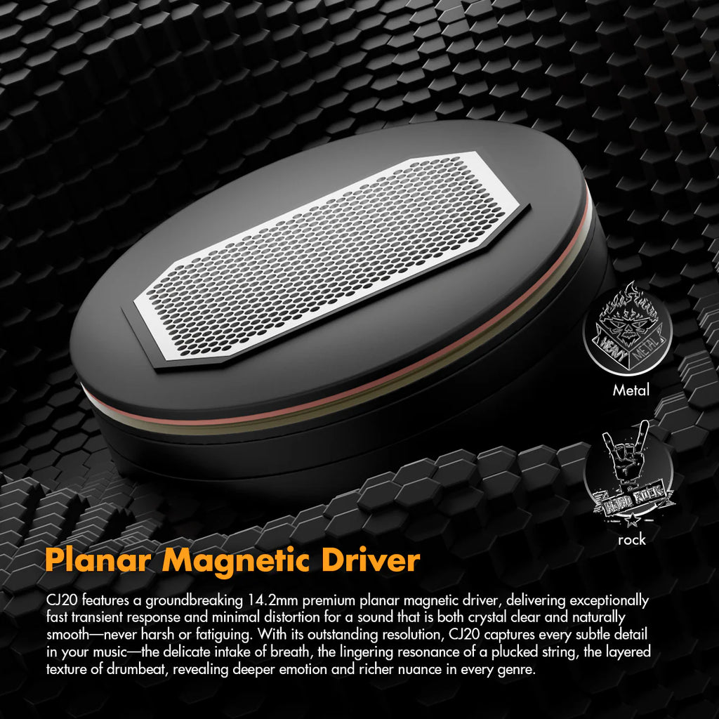 CJ20具有突破性的14.2毫米高階平面磁驅動器,提供超快的瞬態響應和最小的失真,使聲音既清晰又自然流暢——從不刺耳或疲勞。 憑藉其出色的解析度,CJ20捕捉了您音樂中的每一個微妙細節——微妙的呼吸、撥絃的揮之不去的共鳴、鼓拍的分層紋理,揭示了每種流派中更深層次的情感和更豐富的細微差別。