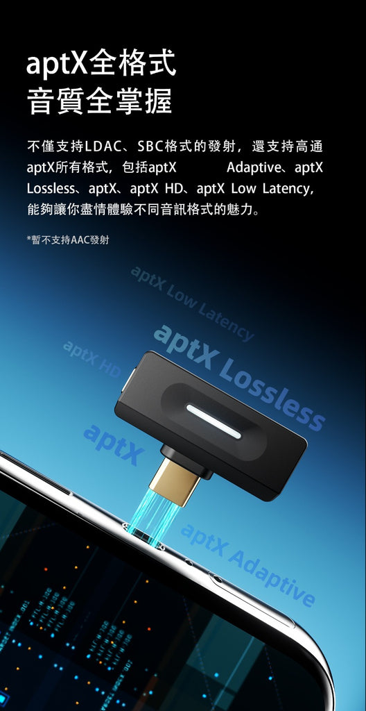 不僅支持LDAC、SBC格式的發射,還支持高通aptX所有格式,包括aptX Adaptive、aptX Lossless、aptX、aptX HD、aptX Low Latency,能夠讓你盡情體驗不同音訊格式的魅力。