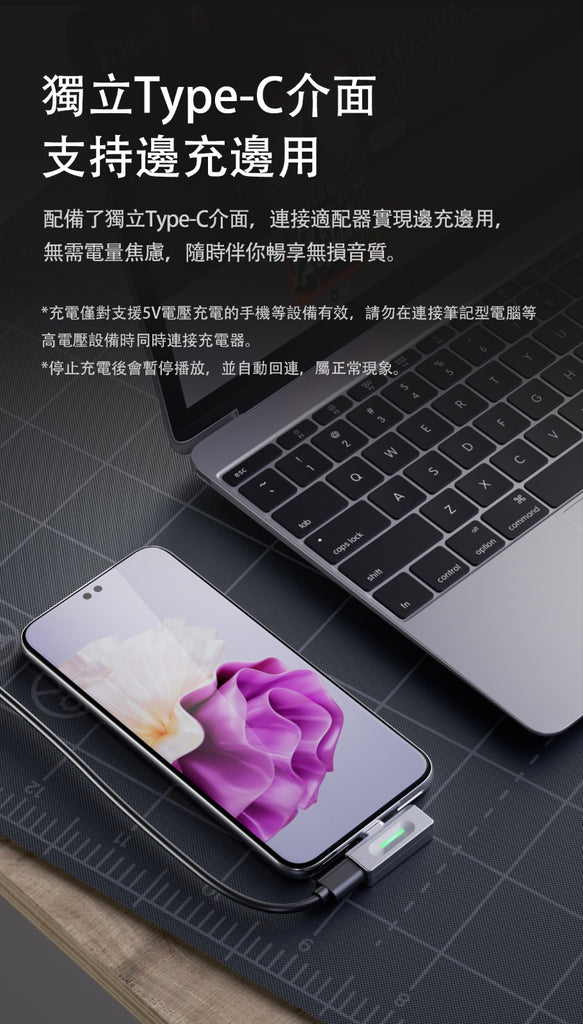 配備了獨立Type-C介面,連接適配器實現邊充邊用,無需電量焦慮,隨時伴你暢享無損音質。