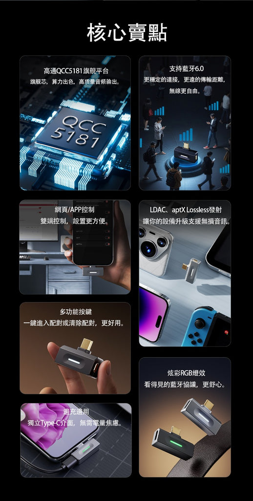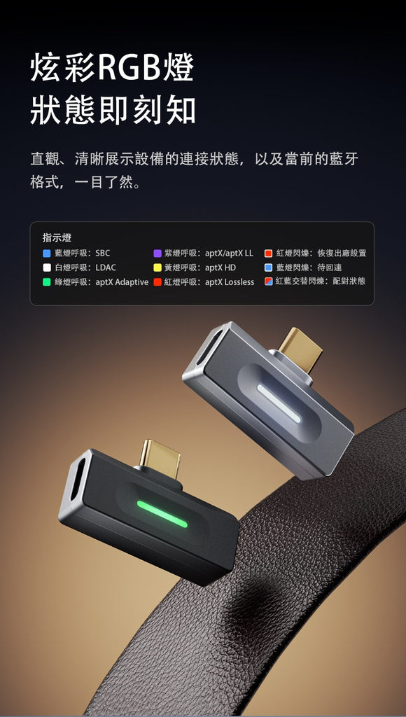 隨插即用,讓你的設備升級支援LDAC、aptX Adaptive 96kHz/24bit和aptX Lossless,追劇觀影,聽歌娛樂,都會讓你耳目一新!還有Hi-Res Audio Wireless金標認證,帶來優質的無線音訊體驗。
