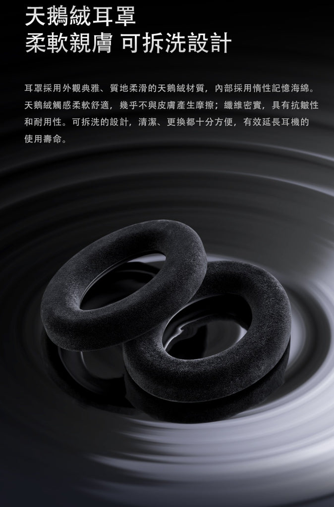 耳罩採用外觀典雅、質地柔滑的天鵝絨材質,內部採用惰性記憶海綿。