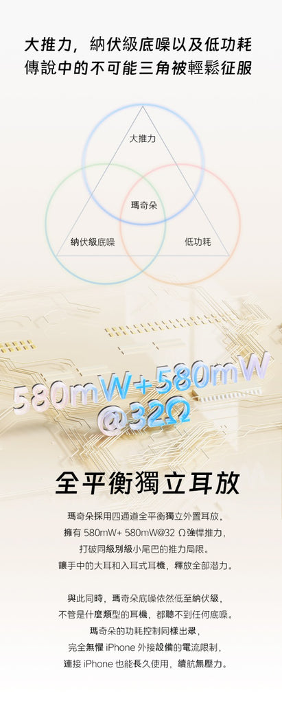 瑪奇朵採用四通道全平衡獨立外置耳放,