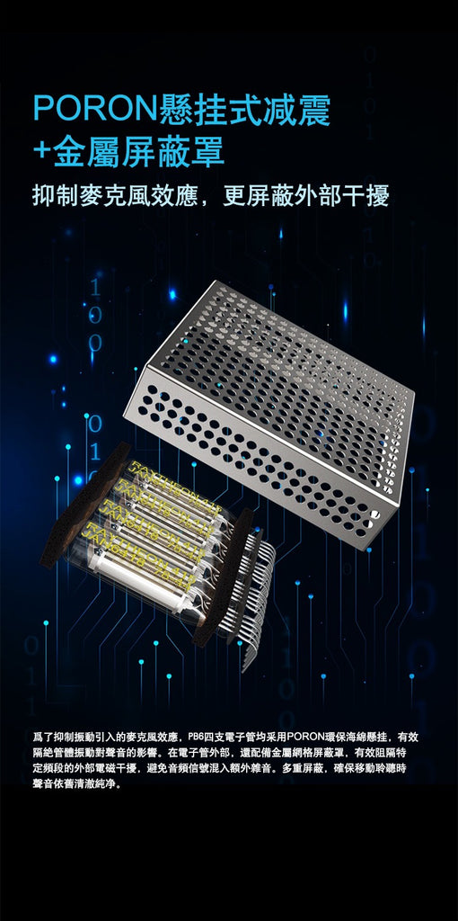 為了抑制振動引入的麥克風效應,PB6四支電子管均採用PORON環保海綿懸掛,有效隔絕管體振動對聲音的影響。在電子管外部,還配備金屬網格遮罩罩,有效阻隔特定頻段的外部電磁干擾,避免音訊信號混入額外雜音。多重遮罩,確保移動聆聽時聲音依舊清澈純淨。