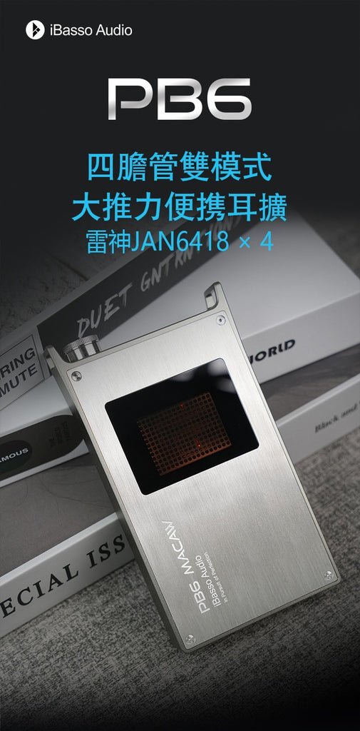 PB6 採用4顆軍工級雷神JAN6418直熱五極管,打造四通道全平衡放大架構。艾巴索為其設計了高達22.5V的陽極供電,提供充足的Headroom和強勁動態。所有電子管均由工程師通過APX555嚴格測試匹配,保證聲道一致性及出色的聲音表現。全平衡架構帶來醇厚溫暖的膽味,使音樂呈現自然悠長的聽感。