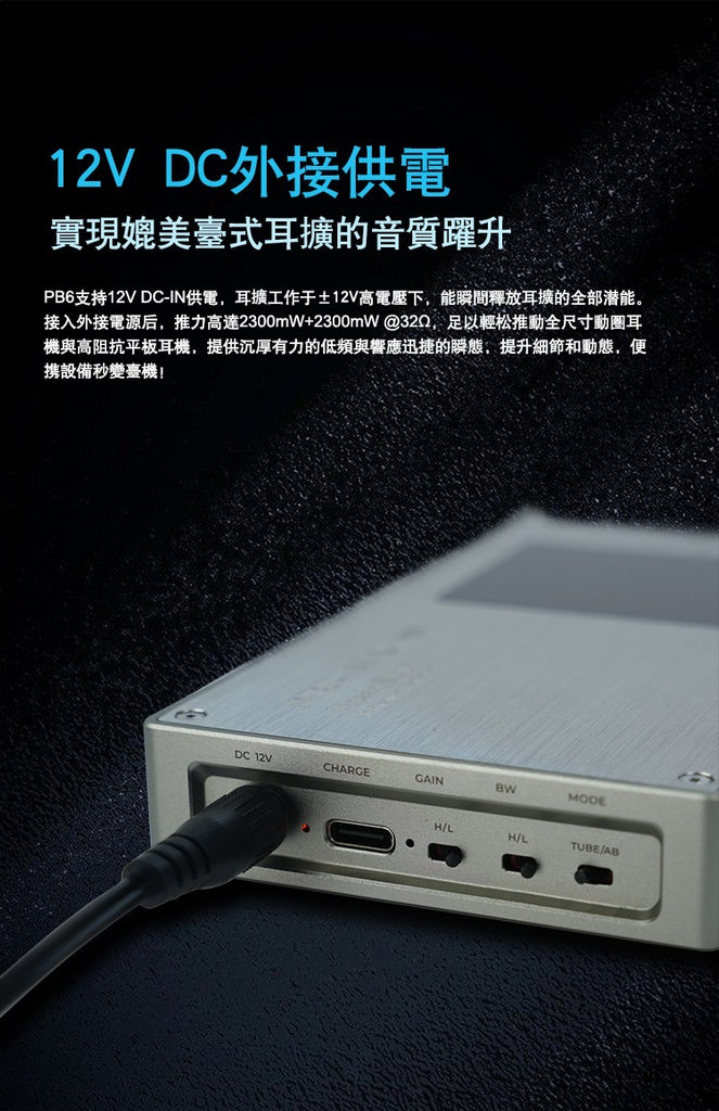 PB6支持12V DC-IN供電,耳放工作於±12V高電壓下,能瞬間釋放耳放的全部潛能。接入外接電源後,推力高達2300mW+2300mW @32Ω,足以輕鬆推動全尺寸動圈耳機與高阻抗平板耳機,提供沉厚有力的低頻與回應迅捷的瞬態,提升細節和動態,可攜式裝置秒變台機!